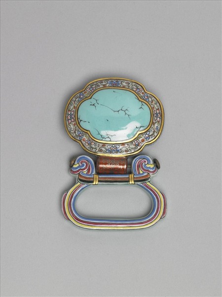 瓷製帶板,全器呈橢圓形,兩邊微微突出。正面中央帶一橢圓形開光,內施淺藍釉為地,並以黑彩描繪裂紋。開光外緣為白地寬弦紋,繪有藍、紅、粉紅各色花葉紋,弦紋週邊塗敷金彩。器身側邊為白地,並滿繪藍色花葉紋。帶板一側接一中空長管,以橫貫而過的金屬長釘連接一橢圓瓷環。紅色管身表面滿繪銀色花葉紋。環身正面繪紅、黃、藍 、黑各色條紋。器背略凹陷,中央帶一長方框,光素無紋。