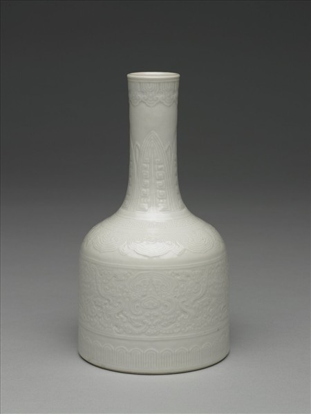 瓷瓶為直口,長頸,削肩,筒形腹與矮圈足。全器通體施濃厚之甜白色釉,頸部上緣以印花技法飾如意雲紋,下緣為長蕉葉紋。肩部飾一圈暗花回紋與印花如意雲紋。腹部上下各有一道弦紋為飾,其間有多對雙龍紋與如意雲紋。腹底飾仰蓮瓣紋。底部除圈足部份外皆上釉,並有「大清乾隆年製」六字三行篆書款。