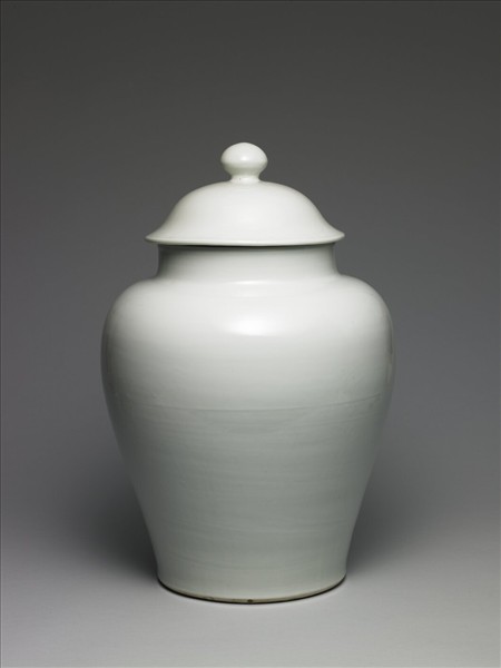 蓋罐。直口,短頸,豐肩,腹上豐下斂,脛部下緣微微外撇,平底,帶圓鈕笠形子母口蓋一。全器施白釉,釉色溫潤。底面無釉,塗淺褐色護胎汁,有轆轤痕;蓋沿內側裡有一墊圈痕,蓋底緣露胎,胎體為白色。