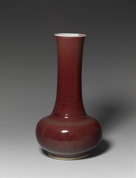 口稍外撇,直長頸,圓腹略扁,圈足。器表施銅紅釉,發色容易受火焰的影響而成各種變化,能有如此紅豔的發色,非常難得。圈足底緣露胎,外底施透明釉。銅紅釉在永樂、宣德時燒造得極為成功,愈往後愈不如前。直到康熙時,由郎延極任江西巡撫,兼管景德鎮時,燒出紅豔生動的銅紅釉,這種釉的燒成相當困難,因此得到了極高的讚譽,而將其歸之於監督官的功勞,因此以監督官的姓冠之於此類產品,稱之為「郎窯紅」。康熙後期出現的豇豆紅及雍正以後的銅紅釉又轉成另一類,但屬於銅紅釉的在後來往往全以「郎窯紅」稱之,可見其成就。