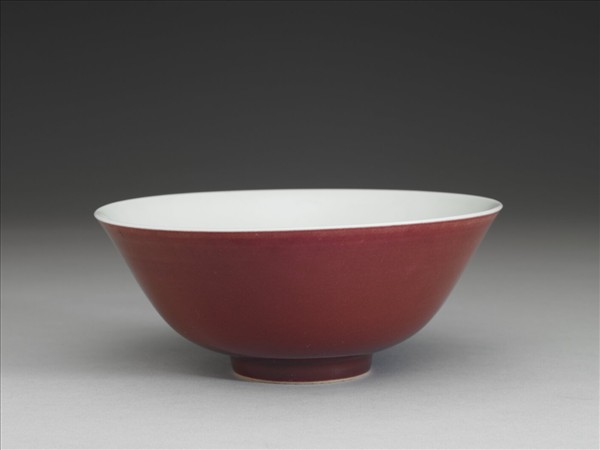 侈口大碗,深壁,平底,圈足。外壁罩銅紅釉,釉色均勻。器內及外底施透明釉,圈足底緣露胎一圈。底書青花雙圈「大清雍正年製」雙行楷款。