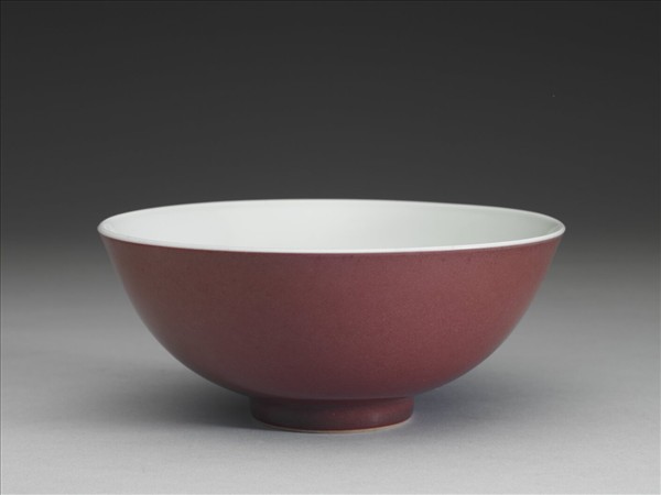 侈口大碗,深壁,平底,圈足。外壁罩銅紅釉,釉色均勻。器內及外底施透明釉,圈足底緣露胎一圈。底書青花雙圈「大清雍正年製」雙行楷款。
