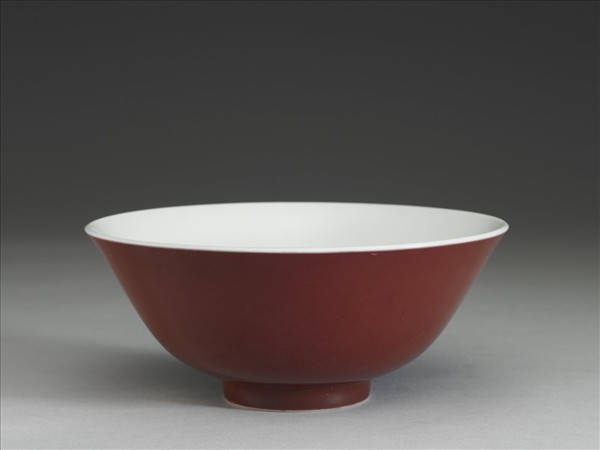 侈口大碗,深壁,平底,圈足。外壁罩銅紅釉,釉色均勻。器內及外底施透明釉,圈足底緣露胎一圈。底書青花雙圈「大清雍正年製」雙行楷款。
