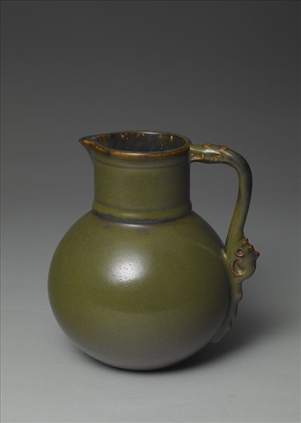 花澆圓口,周緣切平,一側向外突出形成短尖流。短頸,圓碩腹,口腹接一道邊棱,側置一螭形把,口下劃一道,定出螭首銜貼位置。底內挖成臥足,底心淺印「雍正年製」兩行四字篆款。全器罩施茶葉末釉,口部釉層下流,形成褐色邊。釉面清楚可見橘皮棕眼。此器祖型為西亞玉器或金屬器,十五世紀明朝永樂、宣德官窯臨仿之燒製成青花瓷器。由於永樂作品較常出現雙首螭紋柄的造型,故以為此品當是雍正仿永樂之作。回溯明朝,因有與西亞交流的背景,因此瓷花澆的燒製,可視為是反映史實的具體例證。相對於此,雍乾兩朝檔案倒是出現有永宣花澆的紀錄,遂讓人從中推想今日將此類器皿稱作花澆,當是沿襲清宮舊稱。據此也能明白花澆加設出水流口的設計,或是為了進一步落實使用功能,而進行的改良。那麼始見於康熙朝的茶葉末釉加施於外,也讓此品兼具仿古器形和新釉彩的特色。