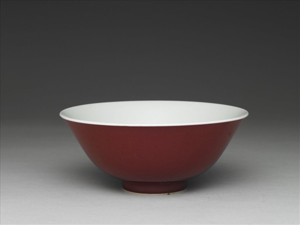 侈口大碗,深壁,平底,圈足。外壁罩銅紅釉,釉色均勻。器內及外底施透明釉,圈足底緣露胎一圈。底書青花雙圈「大清雍正年製」雙行楷款。