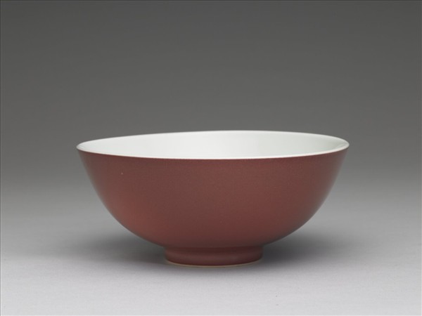 侈口大碗,深壁,平底,圈足。外壁罩銅紅釉,釉色均勻。器內及外底施透明釉,圈足底緣露胎一圈。底書青花雙圈「大清雍正年製」雙行楷款。