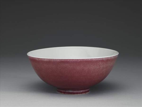 侈口大碗,深壁,平底,圈足。外壁罩銅紅釉,釉色不勻。器內及外底施透明釉,圈足底緣露胎一圈。底書青花雙圈「大清雍正年製」雙行楷款。