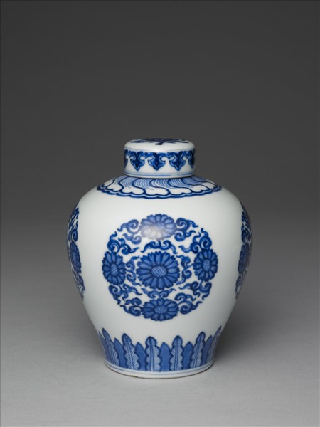 圓口,短直頸,鼓肩,碩腹下斂,平底內凹成足。外型有如上下壓縮之梅瓶,附平頂圓蓋。外壁以釉下鈷藍繪飾紋樣,肩部繪波濤紋一圈,腹外壁等距飾團花紋,近底處蕉葉紋。器外壁所繪波濤、蕉葉,多是以重複且簡單樣式一再重複而成,但團花的設計則別出心裁,其以一花居中,上下左右繪一朵同類花,枝葉蔓生隙地,五花皆作正面盛開,但外圍的四朵花則略成橢圓,宛如以稍側的視角繪寫盛開花,使團花周圍產生微微的空間感,再配合碩弧的外壁形式,更凸顯了團花紋中央朵花的地位。蓋頂面飾折枝桃實,蓋側壁如意雲頭紋。底外釉下青花書「大清雍正年製」雙行六字楷款,外加雙圈。