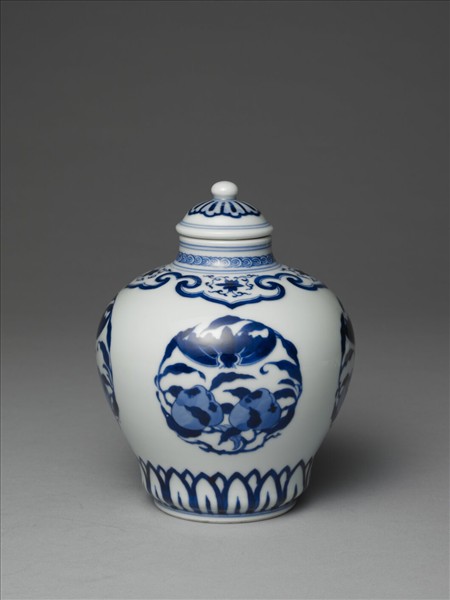 頸畫雲紋一周,肩繪如意雲頭,加飾折枝花卉。腹以蝙蝠及二桃實構成圓形團花,共四組。底邊畫蓮瓣紋一周,蓋面飾八瓣花紋。底青花書「大清雍正年製」六字楷款,外加雙圓圈。