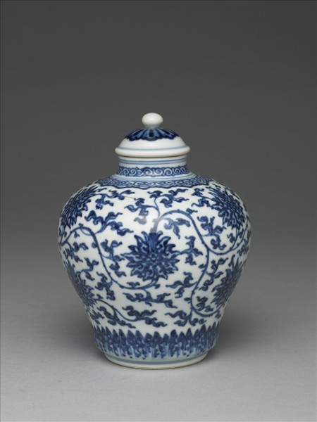 圓口,短頸,碩腹下斂,圈足,帶笠形蓋。全器以釉下鈷藍繪飾紋樣。蓋面蓮瓣一圈。器外壁以纏枝番蓮花葉為主要裝飾圖樣,大朵盛開的番蓮,以及旋繞蔓生的枝葉滿佔外壁,只在近底處繪飾尖形葉一圈。足緣露胎一圈,足內釉下青花書「大清雍正年製」雙行六字楷款,外加雙圈。