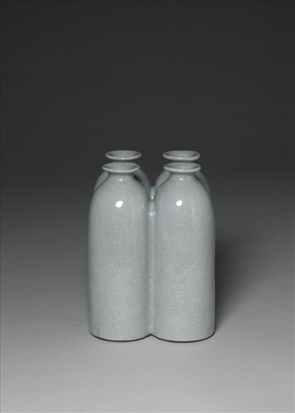 四連瓶,作「田」形配置,每小瓶皆小口外撇,束頸,深直壁,平底。全器施青瓷釉,色天青光潤,帶淡茶色細碎開片。底施青釉,每小瓶底以青花分書「雍、正、年、製」篆款,圈足露胎,塗棕色汁。