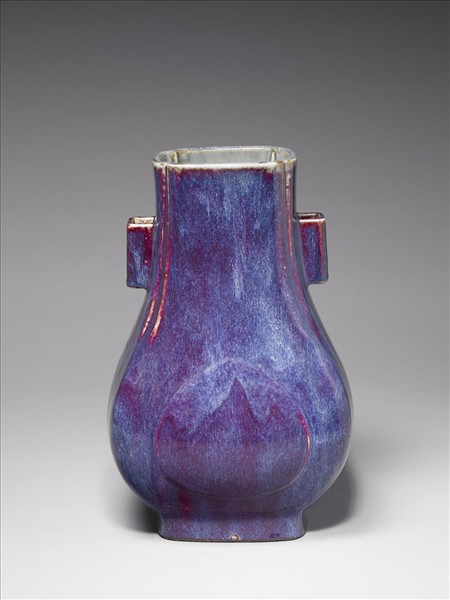 瓶侈口,雙貫耳,斜肩,方形腹,方形圈足。四角之口至肩部有楞紋,腹部前後各施一凸起杏葉紋飾。通體施爐鈞釉,呈紅、靛、紫、月白等多色深淺交匯流動的窯變釉。器底施醬釉,底心印「大清乾隆年製」六字三行篆款,圈足露胎,塗赭色汁。雍正仿鈞釉作品,採多次施釉,燒成過程中,不同金屬元素自然結合,所產生的流動窯變釉色,偏紅、紫色系者,有「玫瑰紅、海棠紫及驢肝、馬肺」之稱。