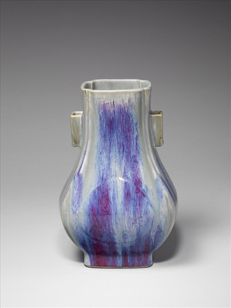 瓶侈口,雙貫耳,斜肩,方形腹,方形圈足。四角之口至肩部有楞紋,腹部前後各施一凸起杏葉紋飾。通體施爐鈞釉,呈紅、靛、紫、月白等多色深淺交匯流動的窯變釉。器底施醬釉,底心印「大清乾隆年製」六字三行篆款,圈足露胎,塗赭色汁。雍正仿鈞釉作品,採多次施釉,燒成過程中,不同金屬元素自然結合,所產生的流動窯變釉色,偏紅、紫色系者,有「玫瑰紅、海棠紫及驢肝、馬肺」之稱。