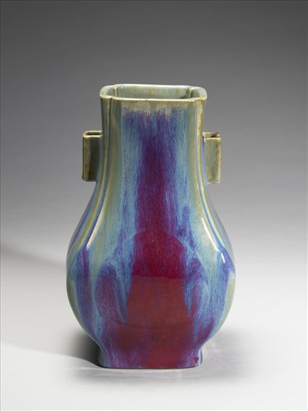 瓶侈口,雙貫耳,斜肩,方形腹,方形圈足。四角之口至肩部有楞紋,腹部前後各施一凸起杏葉紋飾。通體施爐鈞釉,呈紅、靛、紫、月白等多色深淺交匯流動的窯變釉。器底施醬釉,底心印「大清乾隆年製」六字三行篆款,圈足露胎,塗赭色汁。雍正仿鈞釉作品,採多次施釉,燒成過程中,不同金屬元素自然結合,所產生的流動窯變釉色,偏紅、紫色系者,有「玫瑰紅、海棠紫及驢肝、馬肺」之稱。