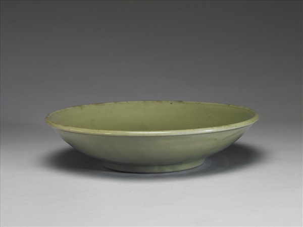 大敞口盤,圓口唇棱,弧形壁、寬圈足。內底寬平,周緣凹下,底心印折枝花卉,印紋工緻;餘內外壁均光素無飾,釉色光澤沈斂。裹足滿釉,底部留有環形無釉墊燒痕,環形邊緣雜錯不整。