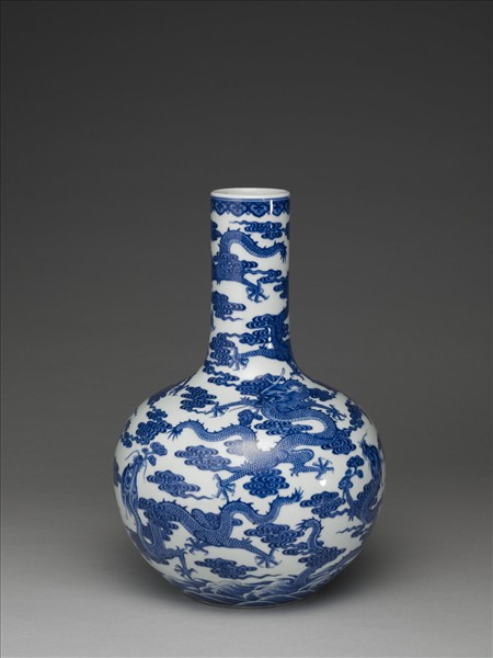 天球瓶,圓口,直長頸,碩腹,平底內凹成足。全器紋樣,通體以釉下青花繪飾九龍紋樣。口緣繪飾一周如意雲頭紋,通體自頸至腹繪九龍,龍翔舞於雲紋與水波紋間,這些飛龍姿勢各異,其中數尾以一顆火珠為中心,從不同方向靠近火珠,或吼叫威嚇,或注視火珠蓄勢待發,或彎曲肢體,如正向火珠迅速靠近,表現諸龍爭奪火珠的場景。除此之外,這些龍或口啣芝草、或手握靈芝,則在緊張的氣氛中,增添吉祥的氣息。底外白釉地青花書「大清乾隆年製」三行六字篆款。
