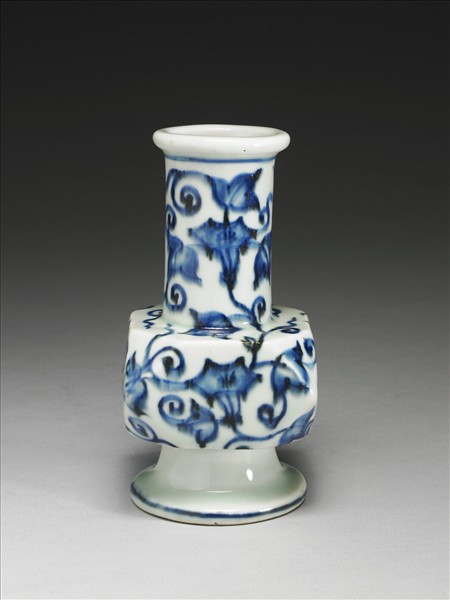 瓶,圓口卷邊,腹部扁方折角,高圈足外撇。頸腹釉下繪飾青花,作轉枝牽牛花圖案,圈足露胎一圈,底外楷書「 大明宣德年製」六字雙行雙圈款。這種樣式的瓷器,最為人所知的當屬院藏〈明 無款 青花牽牛花紋折方瓶〉(故瓷16788)。若比較兩者,本器花葉釉色如畫紙遇水,顯現如圖樣侵潤暈開的效果,且牽牛花較為挺直,葉內卷的程度較大,紋飾繪作者似有意將牽牛花置於畫面中央,並未表現如〈明 無款 青花牽牛花紋折方瓶〉上牽牛花略微欹側的動態。不論這些差異是否意味著時代的區別,我們都應注意到牽牛花這項紋飾,其常見於元代大盤和其他花紋一起裝飾,獨擔一面的牽牛花紋則始見於明初官窯。牽牛花不常見於一般紋飾,應是受波斯文化的影響。
