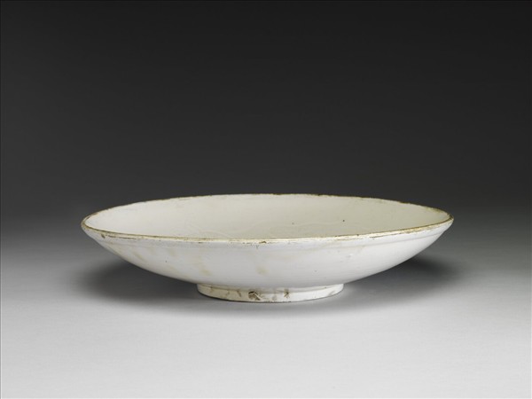 敞口,弧壁下斂,圈足。口緣露胎,可見本器以覆燒技法製作。整器施白釉,釉色呈牙白,器外壁可見多道弦紋,器內壁則以劃花技法刻畫一蟠龍,以為本器之主要紋飾。