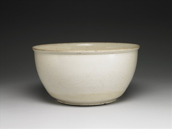 圓口有唇,略外撇,深弧壁,圈足。整器施白釉,釉色白中透黃,口沿露胎,圈足滿釉。器外壁劃花荷蓮為飾,器內壁劃花蓮塘荷葉,並有水鳥漫步其間。