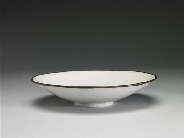 敞口,作六瓣花式,弧壁下斂,圈足。整器施白釉,釉色瑩白,圈足滿釉,口緣無釉鑲銅釦棱。器外壁光素無紋,內壁自瓣口委角處各向盤心劃直線一道,將內壁分為六部分,內底則印花蓮葉為飾。