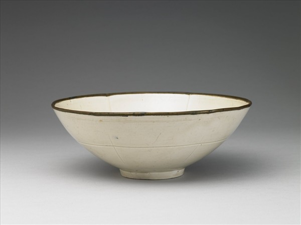 敞口,作六瓣花式,弧壁下斂,圈足。整器施白釉,釉色泛黃,圈足滿釉,口緣無釉,鑲銅釦棱。器外壁弦紋一道,並自瓣口委角處輕畫直線一道與弦紋相交。內壁自瓣口委角處各向盤心劃直線一道,將內壁分為六部分,內底則印花蓮葉為飾。
