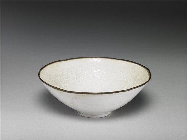 敞口、弧形深壁、淺圈足。口作六瓣花式,曲弧不明顯。釉色牙白,釉質瑩潤。口緣無釉鑲銅邊,足底局部露胎。外壁光素,碗裡內壁滿印紋飾:口緣下為回紋一周,器壁飾牡丹纏枝紋。三朵盛開的牡丹間有三位身著錦褂的孩童嬉戲其間,或攀或臥,體態活潑惹人憐愛。