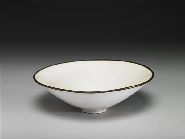 廣口微撇、淺腹、圈足窄淺。全器施牙白色透明釉,釉質瑩潤,口緣無釉鑲銅釦,釦邊及足底微露白胎。外壁光素,器腹有數道刀刻痕。器內飾以劃花蓮紋,刀法流暢。圈足滿釉。