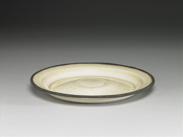 敞口,折沿,淺壁,平底。內底心外凸,中心處又作圓形內凹,內凹處光素無紋,周圍滿飾印花卷枝荷蓮花葉,器外壁則光素無紋。全器施白釉,釉色白中略黃,圈足滿釉,口沿無釉鑲銅釦棱。