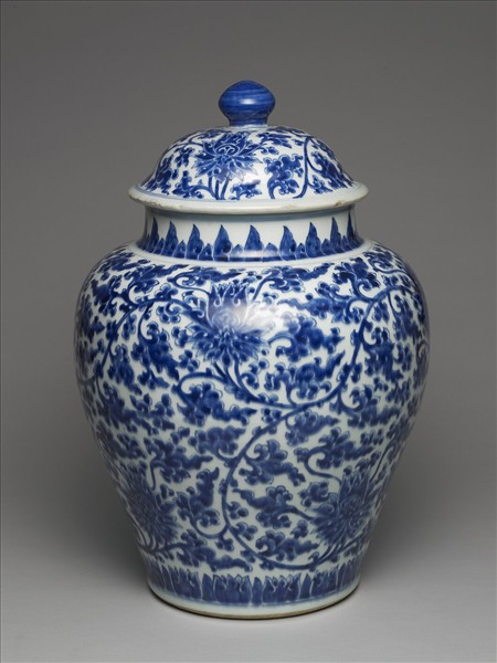 青花蓋罐,圓口略侈,圓唇。短直頸,豐肩,鼓腹下斂,平底微凹,帶寶珠鈕笠形子母口蓋。全器以鈷藍畫花,青花呈色濃艷,餘罩施白色釉,釉色勻淨。蓋外自青花鈕下畫弦紋兩道,蓋面彩繪三朵轉枝番蓮花葉紋,蓋沿飾弦紋兩道。罐口沿畫弦紋一道,頸及底邊分飾蓮瓣紋一周,折肩處與底邊各繪有弦紋兩道。腹部主紋飾轉枝番蓮花,其餘隙地滿佈如卷草般的葉紋。蓋鈕傷斷,罐口及蓋沿多處有傷露胎,底外無釉露白胎,有轆轤痕。