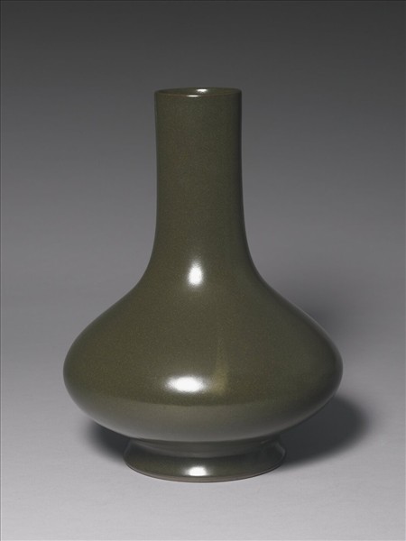 瓶,直口,長頸,斜肩,扁腹,圈足。全器施茶葉末釉,呈橄欖綠色,釉色均勻沉穩。圈足底緣露胎,塗淺褐色護胎汁,底心模印「大清乾隆年製」六字三行篆款。
