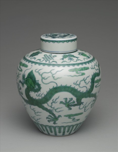 斂口,短頸,豐肩,斂腹,凹足,帶平頂蓋一。蓋及壺身皆由青花勾畫紋飾之輪廓線、再填彩。在罐腹兩側各畫一行龍,龍身成波曲狀行走,在青花輪廓線內填以綠釉彩,在龍的周間畫火焰紋及朵雲紋,罐肩飾一圈佛教八吉祥及如意雲紋邊飾,腹下為蓮瓣紋飾,蓋面寬平,繪有一龍及火珠紋,隙地飾火焰紋,蓋緣邊點以如意雲紋。底青花書「大清乾隆年製」六字三行篆款。