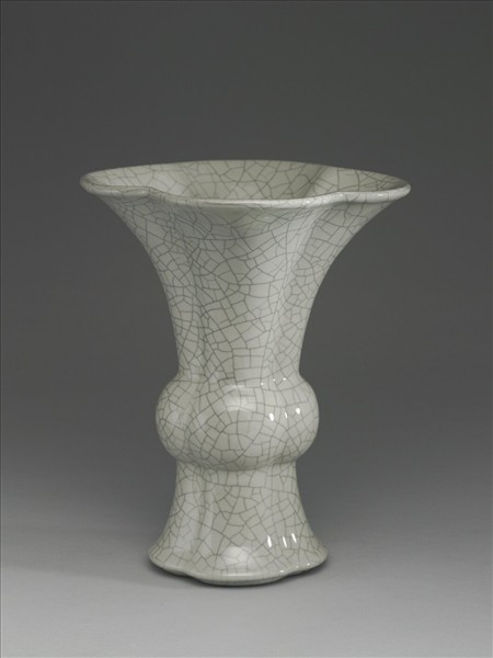 瓶,器仿青銅器觚形,海棠形,自口至底均作四瓣式棱,喇叭撇口,小鼓腹,足脛外撇,矮圈足。通體施灰青釉,釉汁瑩厚,仿哥窯有黑色開片紋。圈足露胎,塗赭色汁,乃仿紫口鐵足。底中心有青花書「大清雍正年製」六字三行篆款。