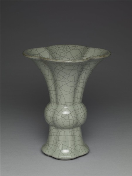 瓶,器仿青銅器觚形,海棠形,自口至底均作四瓣式稜,喇叭撇口,小鼓腹,足脛外撇,矮圈足。通體施灰青釉,釉汁瑩厚,仿哥窯有黑色開片紋。圈足露胎,塗赭色汁,乃仿紫口鐵足。底中心有青花書「大清雍正年製」六字三行篆款。
