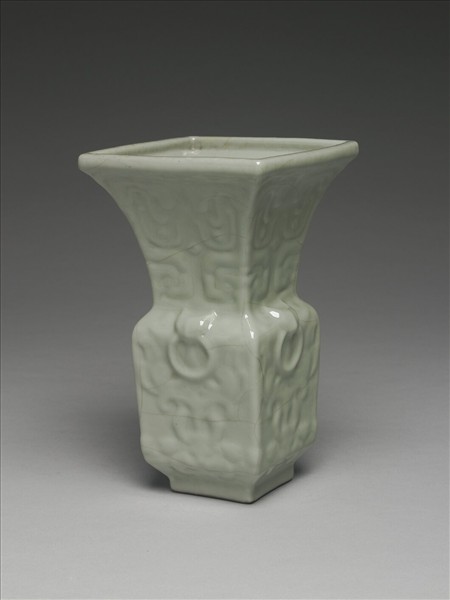 方形瓶,做大撇口,長方腹的方尊樣,方形圈足。頸部模印對夔紋,肩部有獸首銜環紋,腹部飾獸首紋;全器施青釉,釉色潤澤,有稀疏開片紋。足底塗護胎汁,呈鐵黑色,底部中央有青花書「大清雍正年製」六字三行篆款。