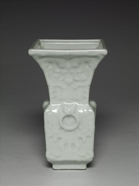 方形瓶,做大撇口,長方腹的方尊樣,方形圈足。頸部模印對夔紋,肩部有獸首銜環紋,腹部飾獸首紋;全器施青釉,釉色潤澤,有稀疏開片紋。足底塗護胎汁,呈鐵黑色,底部中央有青花書「大清雍正年製」六字三行篆款。