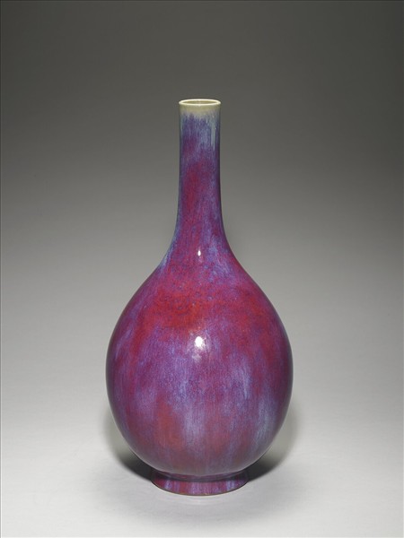 直口,長頸,斜肩,梨形腹,圈足。全器施爐鈞釉,以紫為主色調,呈紅、靛、紫、月白等多色深淺混雜流動窯變釉。器底施醬釉,底心印「大清乾隆年製」六字三行篆款,足端露胎,呈赭色。仿鈞窯變釉為雍正時出現的新品種,係仿鈞釉色繁衍而來,採多次施釉,燒成過程中,不同金屬元素自然結合,所產生的流動窯變釉色,一般偏紅者,稱「火焰紅」。