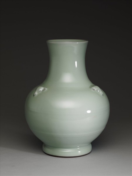 微侈口,長頸,圓腹,圈足。肩部有三個羊首裝飾,肩部、腹中央及腹下方各有兩道凸弦紋。全器仿汝釉,呈冬青色。足底呈褐色。底青花書「大清乾隆年製」六字三行篆書款。