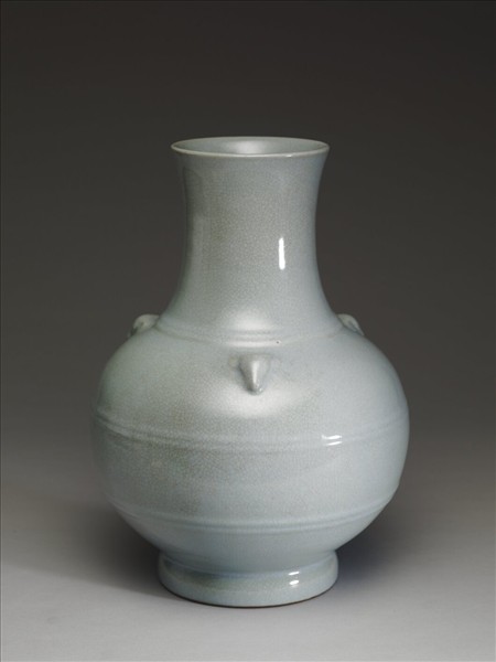 微侈口,長頸,圓腹,圈足。肩部有三個羊首裝飾,肩部、腹中央及腹下方各有兩道凸弦紋。全器仿汝釉,呈灰青色,釉面有細密淺褐色開片裂紋。足底呈褐色。底青花書「大清乾隆年製」六字三行篆書款。
