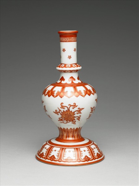 口作一圈唇邊,長頸的下部凸出一圈圓棱,瓶腹外鼓至底部向內斂收,至底座又向外開敞。口沿飾回紋,頸部為朵梅、蓮瓣、如意雲紋,腹部為折枝蓮和蕉葉紋,圈足飾蓮瓣紋。紋飾皆以細筆勾描輪廓再填彩,線條纖細而流暢,紅彩敷染勻稱。足底露胎呈白色。