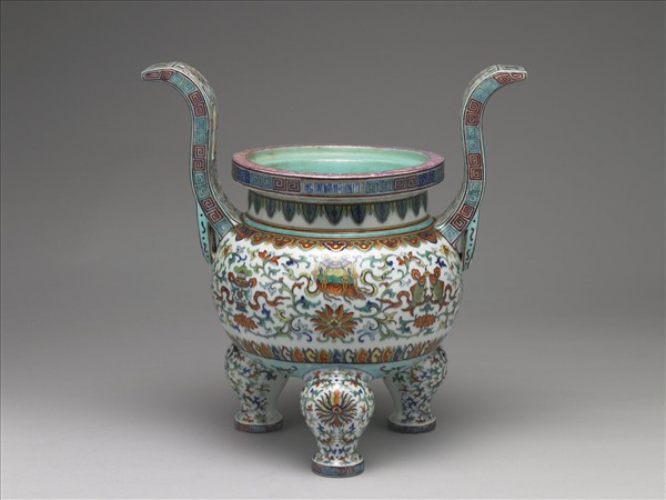 器形為三足鼎的式樣。口有寬折沿,嵌入式口。束頸、圓碩腹、圓底、三蹲式獸足。足內側有小孔以便燒造時不致於生燒。口沿繪綠地卷枝花卉紋,耳飾番蓮紋及蝠紋,口沿側及雙耳側飾雷紋。頸部飾蕉葉紋一圈,肩飾如意雲頭紋,腹部為蓮花托佛教八寶─輪、魚、蓋、罐、花、盤長、螺及傘,下緣飾彩色蕉葉紋一圈,三足飾卷枝番蓮花,底為淺藍地,中央繪一朵花,外圍一圈黃地卷枝花卉,各足間各飾一朵卷枝蓮花紋。紋飾為粉彩繪成,底色為白色,器內為湖綠釉。足底露胎,塗護胎汁,呈淺褐色。口邊有青花篆款「大清乾隆年製」,由右向左橫寫。