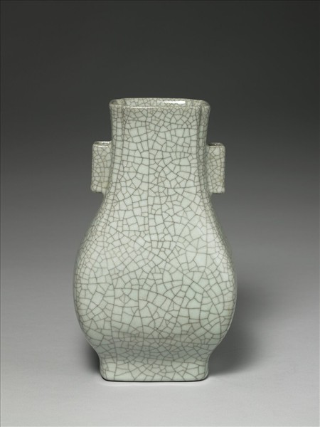 仿銅壺式,長方形委角,微侈口,雙方形貫耳,斜肩,廣腹,矮圈足。腹部前後有一心形隆起,若杏葉狀。全器仿哥窯灰青釉,密佈深色清晰的細開片裂紋。足緣呈黑褐色。底有「大清乾隆年製」三行青花篆書款。