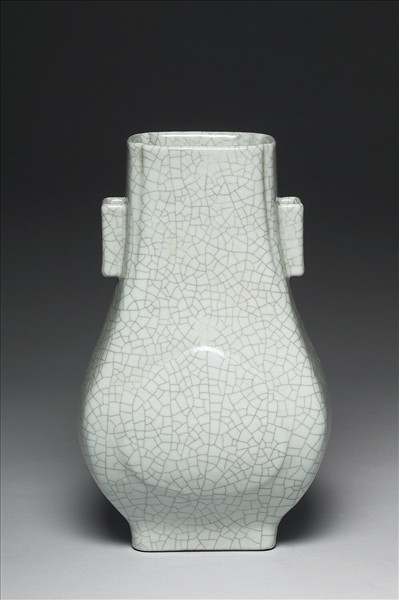 仿銅壺式,長方形委角,微侈口,雙方形貫耳,斜肩,廣腹,矮圈足。腹部前後有一心形隆起,若杏葉狀。全器仿哥窯灰青釉,密佈深色清晰的細開片裂紋。足緣呈褐色。底有「大清乾隆年製」三行青花篆書款。