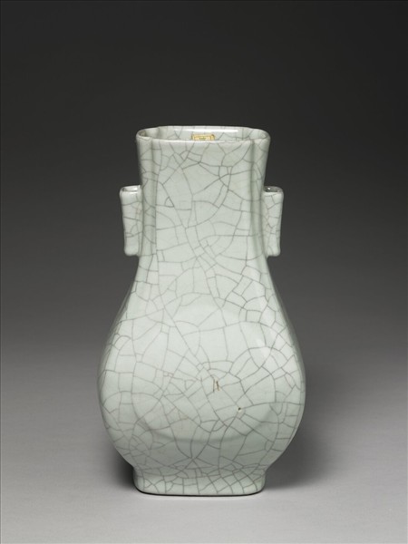 仿銅壺式,長方形委角,微侈口,雙方形貫耳,斜肩,廣腹,矮圈足。腹部前後有一心形隆起,若杏葉狀。全器仿哥窯灰青釉,密佈深色清晰的細開片裂紋。足緣呈黑褐色。底有「大清乾隆年製」三行青花篆書款。