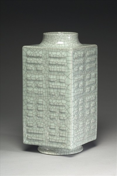 圓口微斂,短頸,長方腹,圈足,器仿禮器玉琮形制,中圓外方。通體施仿哥釉,色灰青,帶細密的灰色與無色開片。器腹每面貼飾八卦卦象一組。圈足露胎,塗赭色汁,底心青花書「大清乾隆年製」三行六字篆款。