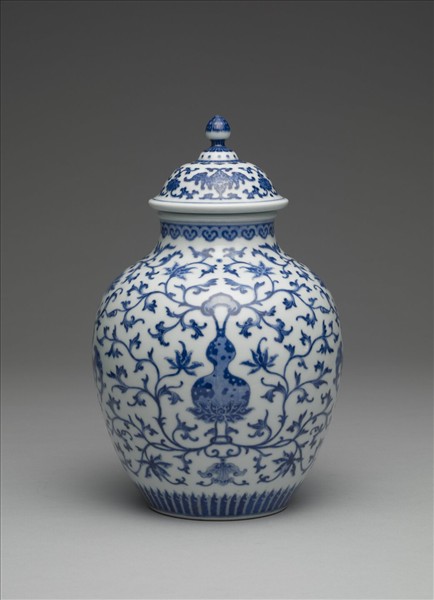 青花蓋罐,斂口、短頸、豐肩、碩腹下斂、平底凹足、帶蓮苞鈕蓋。口緣飾如意雲紋一周,器身滿飾纏枝番蓮紋,並飾蝙蝠、葫蘆和如意等紋樣。底邊飾變形蓮瓣紋一周。足底露胎,足內施白釉,有青花書「大清乾隆年製」三行六字篆款。蓋鈕呈一蓮苞狀,蓋面上層飾蓮瓣紋與連珠紋,下層飾如意雲頭紋以及三組纏枝番蓮紋與蝙蝠相間,蓋緣飾弦紋一道。