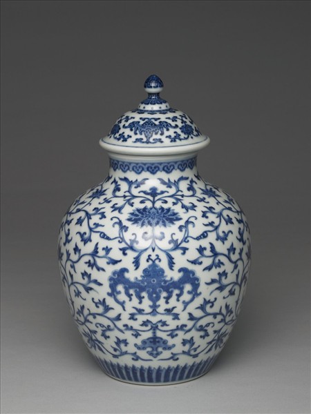 青花蓋罐,斂口、短頸、豐肩、碩腹下斂、平底凹足、帶蓮苞鈕蓋。口緣飾如意雲紋一周,器身滿飾纏枝番蓮紋,並飾蝙蝠、葫蘆和如意等紋樣。底邊飾變形蓮瓣紋一周。足底露胎,足內施白釉,有青花書「大清乾隆年製」三行六字篆款。蓋鈕呈一蓮苞狀,蓋面上層飾蓮瓣紋與蓮珠紋,下層飾如意雲頭紋以及三組纏枝番蓮紋與蝙蝠相間,蓋緣飾弦紋一道。