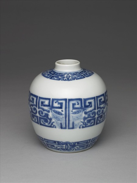 青花獸面紋罐,斂圓口、短頸、豐肩、碩腹、底微斂、淺凹足。器腹中段畫三組獸面紋飾,上下留白,肩部與底邊亦各繪獸面紋一周。胎骨均勻,潔白細膩,白釉瑩潔,青花呈色勻淨鮮麗。底以鈷藍書「大清康熙年製」六字二行楷款,外加雙圈。