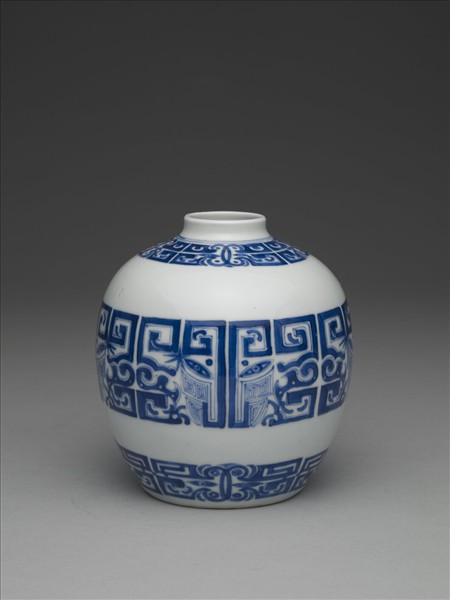 青花獸面紋罐,斂圓口、短頸、豐肩、碩腹、底微斂、淺凹足。器腹中段畫三組獸面紋飾,上下留白,肩部與底邊亦各繪獸面紋一周。胎骨均勻,潔白細膩,白釉瑩潔,青花呈色勻淨鮮麗。底以鈷藍書「大清康熙年製」六字二行楷款,外加雙圈。
