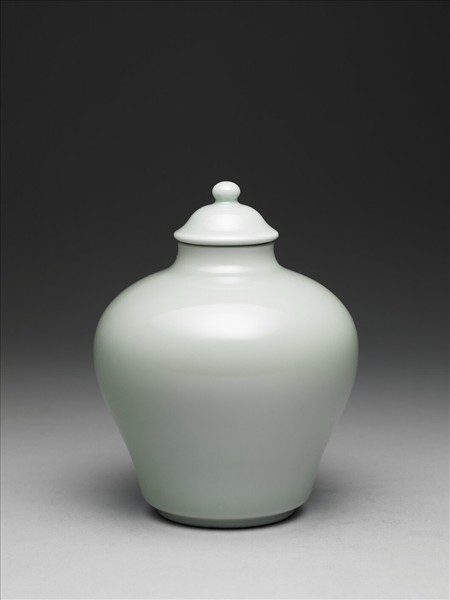 圓口略侈,束頸,碩腹,下斂漸收為直壁,圈足,帶寶珠鈕蓋。全器施青釉,釉色淡青而偏白,蓋面積釉處青釉較深,釉面平滑勻淨。圈足露胎一圈,足內施青釉書青花「大清雍正年製」六字二行雙圈楷款。