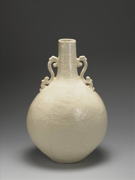 圓口直頸,斜肩,扁圓腹,腹壁微外鼓,卷草耳,平底內凹為足。全器白釉,其色白中透黃,器壁印花飛龍翔舞於雲間海上。足露胎,足內白釉。